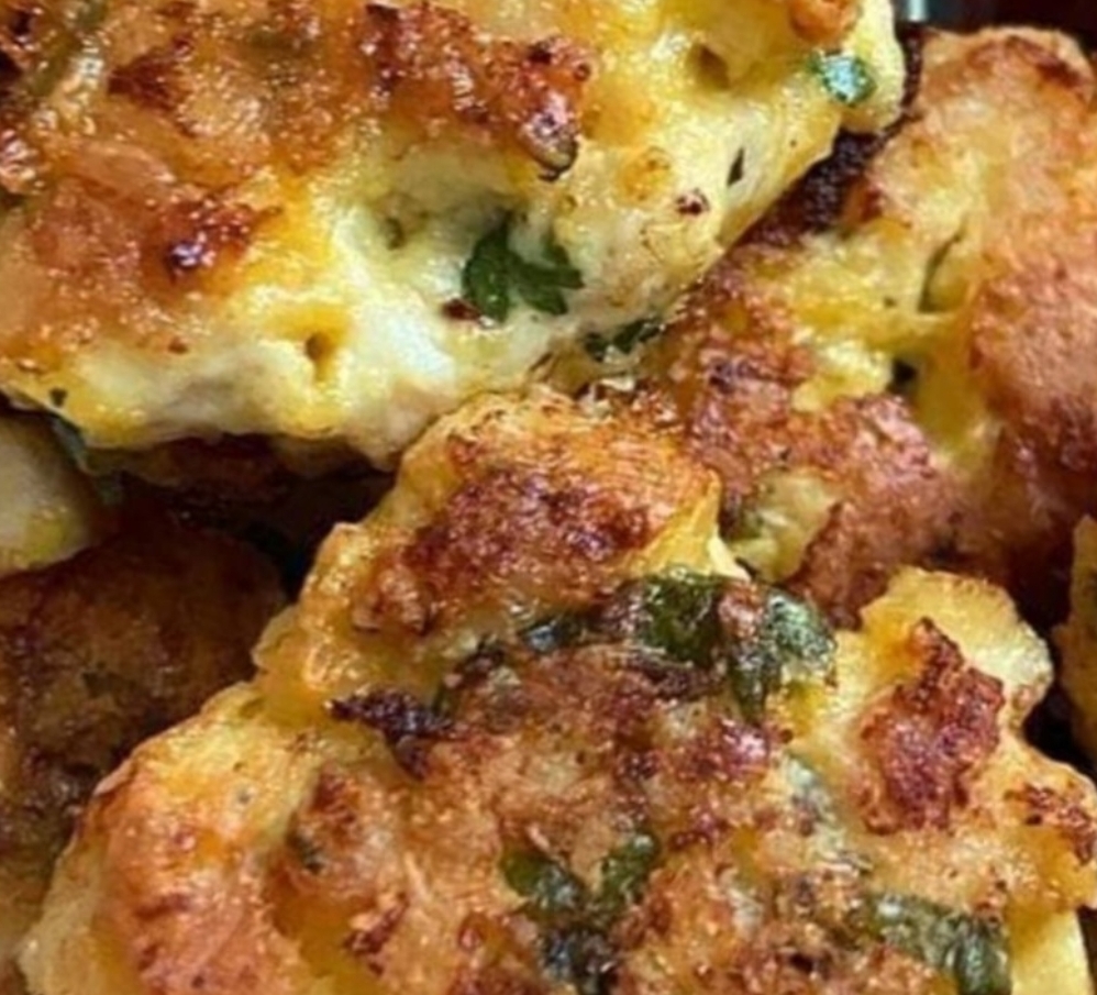 - Heat a large non-stick pan over medium heat and add 2 Tbsp oil. When oil is hot add the chicken mixture a heaping Tablespoon at a time. Slightly flatten out the tops with the back of your spoon and sauté uncovered 3-4 min on the first side then flip and saute 3 min on the second side or until outsides are golden brown and chicken is fully cooked through* Repeat with remaining fritters adding more oil as needed.