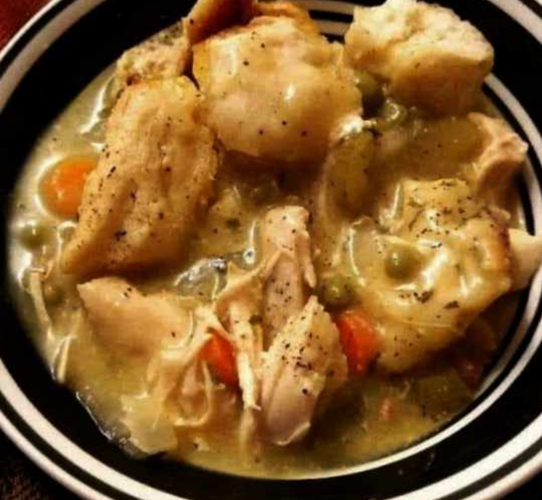 ° I boiled chicken in water and chicken broth.I added:° chicken cream° A hint of poultry seasoning° drops of garlic powder° chopped celery° salt / pepper.I added a can of carrots. Every so often I add a can of cream of celery soup, too.After it simmered for a while, I cut some cookies and let it in.Let them cook just until tender. They will cook away if you cook for too long.