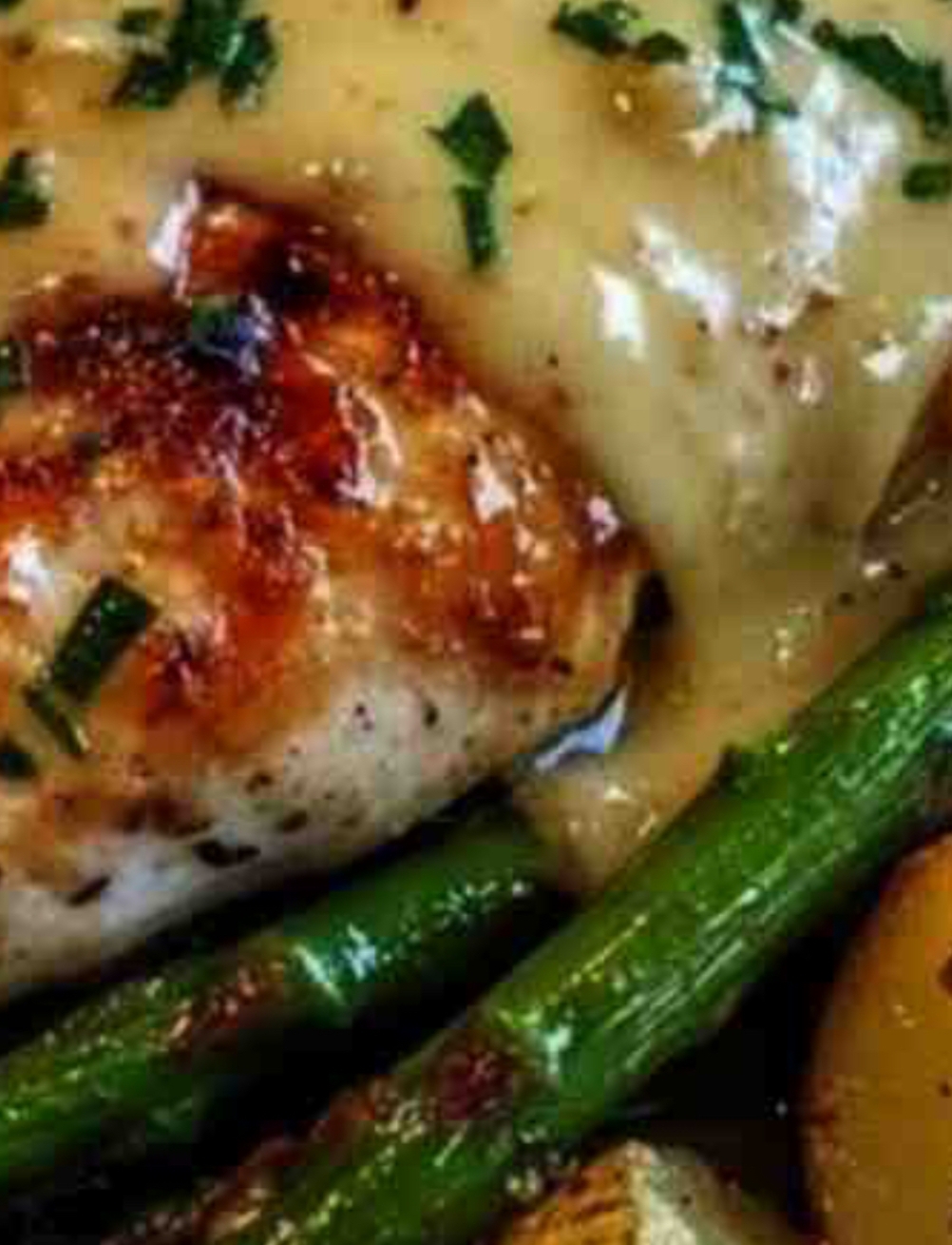It’s paired with crispy roasted potatoes and tender asparagus, all smothered in a creamy Dijon sauce that’s both tangy and sweet. Perfect for an elegant dinner or a cozy weekend meal.