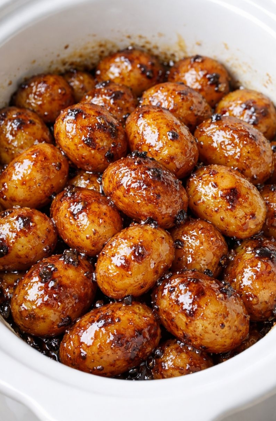 Thicken and caramelize the glaze: Once the potatoes are tender, remove the lid and carefully stir again to coat them in the thickened glaze. Prop the lid slightly ajar with a wooden spoon or folded towel and continue cooking on HIGH for 20 to 30 minutes. This helps some moisture escape so the glaze reduces and clings to the potatoes, forming that shiny, sticky coating with lightly caramelized edges.
