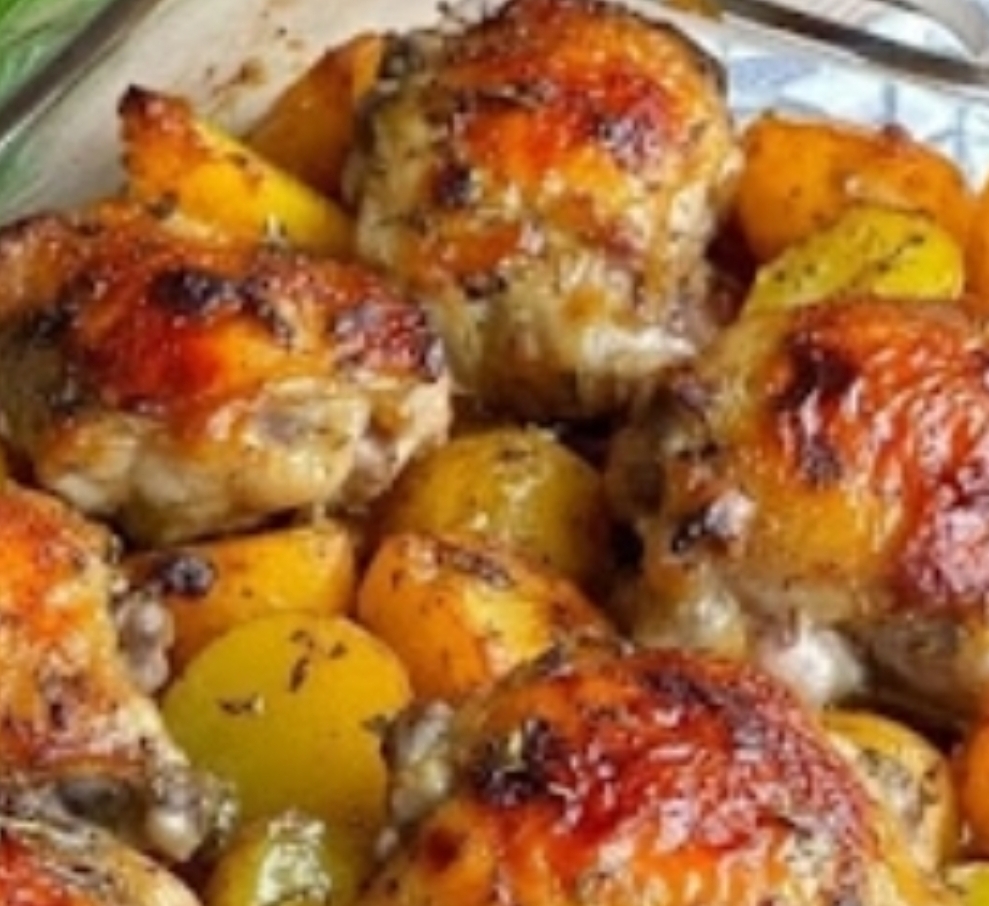 Bake in the oven for 45–55 minutes, or until the chicken is fully cooked (internal temp 75°C/165°F) and the skin is golden brown. Potatoes should be tender and slightly crispy.