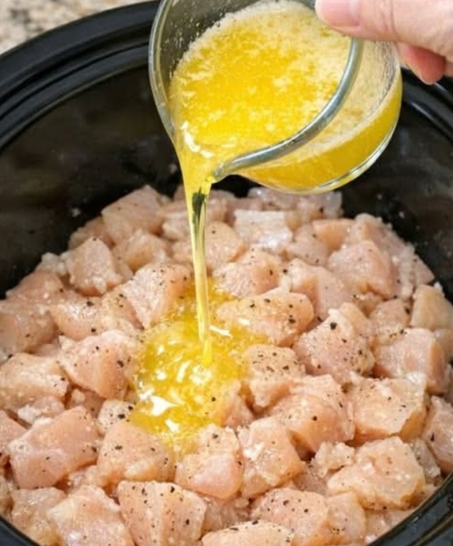 Place the diced chicken into the bottom of your slow cooker. Sprinkle the garlic powder, dried oregano, salt, and pepper evenly over the meat. Pour the half cup of chicken broth into the side of the pot so you don’t wash the spices off the chicken. Finally, pour the melted butter directly over the seasoned chicken. Give everything a quick toss with a large spoon to ensure the cubes are well-coated in the buttery mixture.